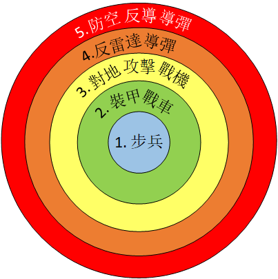 爲了防止自己的對地攻擊飛行器被擊落,美軍會使用電偵設備發現俄軍的雷達和導彈,然後由F16、F35發射反輻射導彈(或者發射制導火箭、巡航導彈、戰術導彈),摧毀俄軍的雷達和導彈。美軍這些火箭彈、導彈、戰機就是包在第三層(對地攻擊飛行器)外的第四層洋葱。