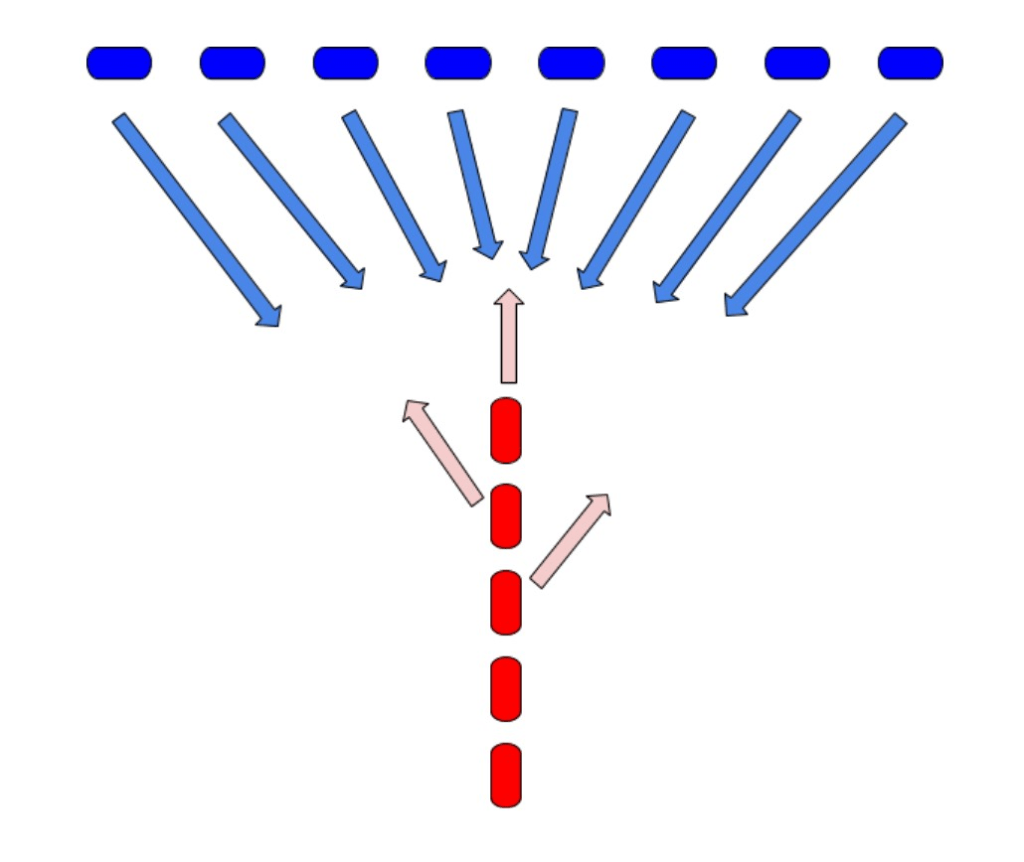 在全靠艦炮的大型海戰中,最有利的陣型就是自己的大型戰艦(下圖中藍色)排成一行,都以側舷面對敵艦,這樣每艘戰艦的最多的主炮能同時向敵艦(紅色)射擊。下圖中藍艦和紅艦構成了字母“T”,這種戰法叫"crossing the T of the enemy"(給敵人橫切了T)。只有最大型的戰艦才有資格排在這個一字序列中,其他的小型的戰艦則在周圍擔任偵察、運輸、救援等輔助工作。